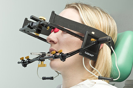 A high-precision measurement device, for the dentist working with functional diagnostics. The upper face-bow is fixed securely to the head by means of 3-point support technology (Nasion and 2x on the forehead) and the head-neck flex-band. The side arms lie without pressure on the ear-saddle. The face-bow is mounted easily and safely and is comfortable for the patient to wear. The light construction of the mandibular bow allows for precise setting of the registration pins onto the exactly determined hinge axis. |